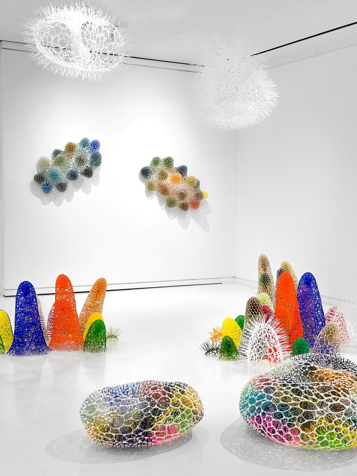 Sui creates three-dimensional organic forms using industrial yet flexible materials, most notably nylon cable ties. Through a hand-built, accumulative process, she interconnects hundreds if not thousands of individual units into biomorphic structures. Though her materials are synthetic and rigid, Sui’s repetitive technique allows her forms to develop fluid, sentient presence over time. Whether small structures or larger, site-specific installations, the almost cellular qualities of these forms transform the space in question, evoking ethereal vibes and a distinctly contemplative feel.