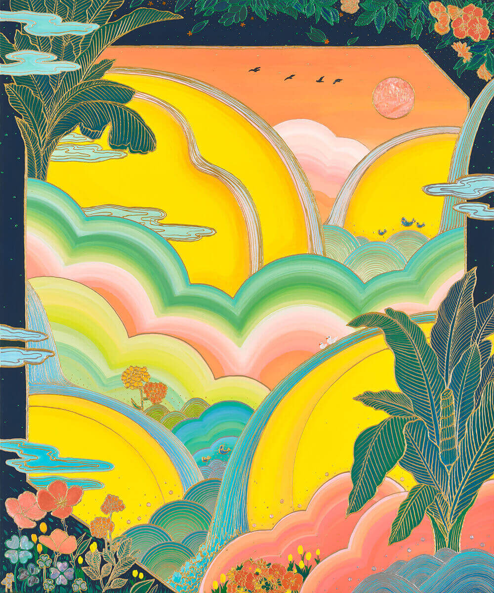 With a fun-loving verve and a consummate finesse reminiscent of the silkiest of brushstrokes, Hyunju cracks open a gateway to an eternal expanse where mundane rhythms subside and hopes of liberation materialize in moonlit skies. Her peach-drenched paradise is a fantastical land of pure enchantment, a realm where visual morsels bear fruit and boundless potential is waiting to be tapped.