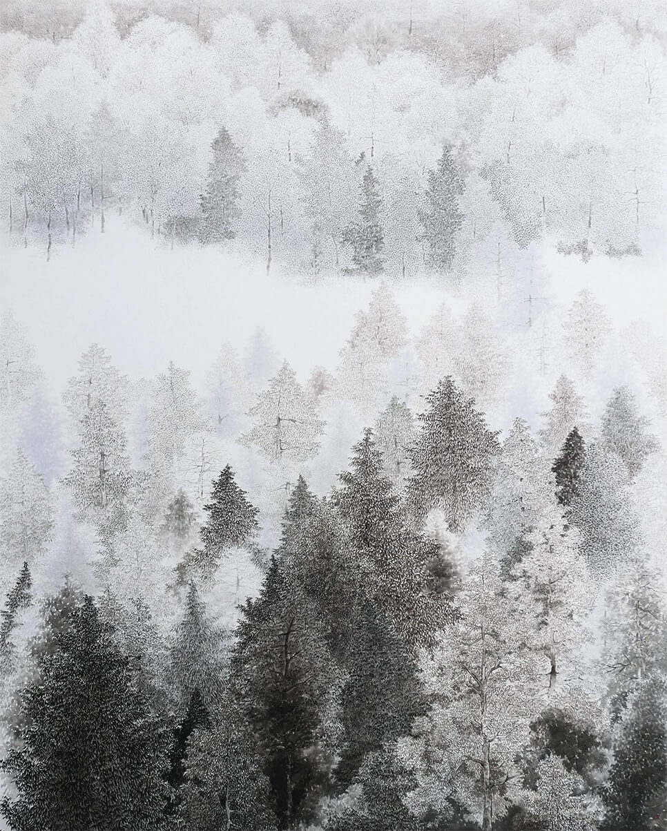 As echoes resonating from the woods, Insue’s sketches transfigure her studio into a realm of the transcendent, an ethereal space where energies pulse, flow, and reverberate eternally. Rather than mimic the visible world, she distills the essence of arboreal presence into her canvas, molding the forest’s forms to mirror her mood. Guided by her conceptual cartography, she orchestrates intricate arboreal vignettes upon hanji, etching the black ink and overlapping the delicate sheets as she goes. Soon, her canvas lends itself to fits of spontaneity, begetting the wondrous imperfections that infuse her creations with an untamed sense of beauty.