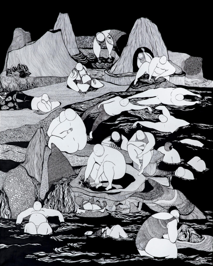 In her “Something Between, to be Between, if it’s Between” series, Sojin’s subjects manifest as “monsters of division and wandering prophets.” They are those destined to lacerate openings between worlds, spaces for the incompatible ones who float, blend, and protrude in and out against the grain. Although they may never settle down or find stability by conventional standards, they will always be extraordinary characters with multiple identities, bravely forging cracks and visualizing in plain sight the human dilemmas of our time.