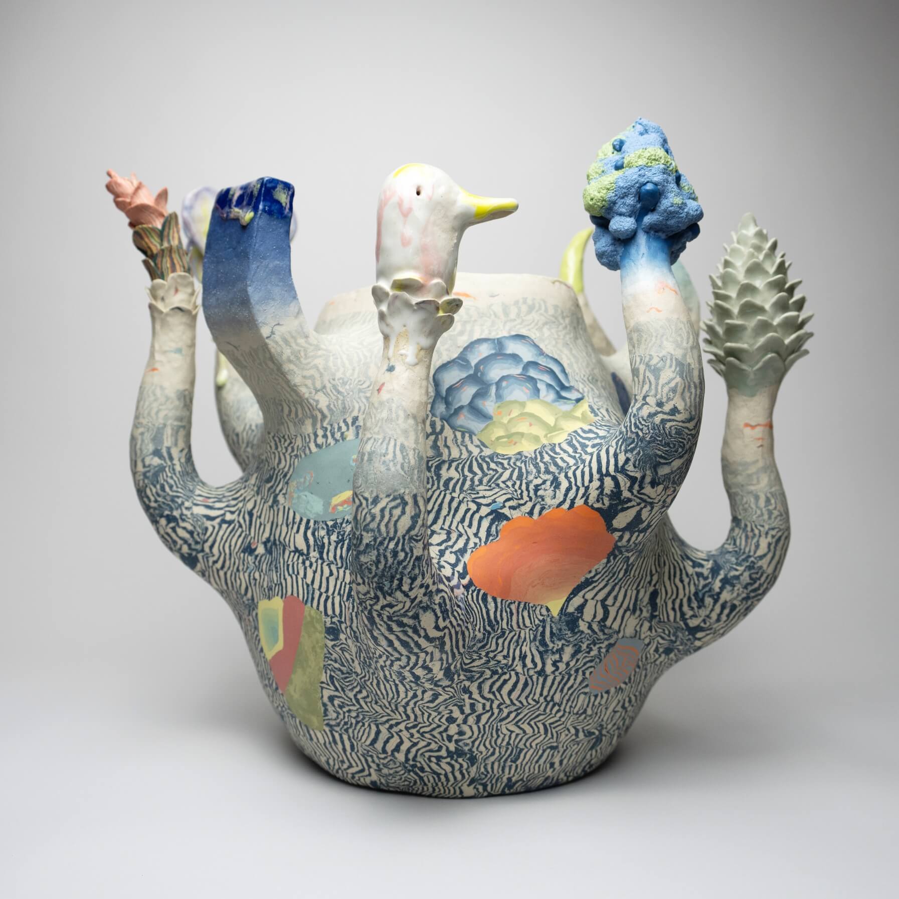 Focusing on themes of matter in transformation, Janny’s work explores issues of agency, instability, and tension inherent in our ever-shifting relationship with nature and technology. Constructed via traditional hand building and nerikomi techniques, her pieces embody transitional moments caught in a state of infinite variability; hybrid spirits that explore the limits of expectations and cultural codes.