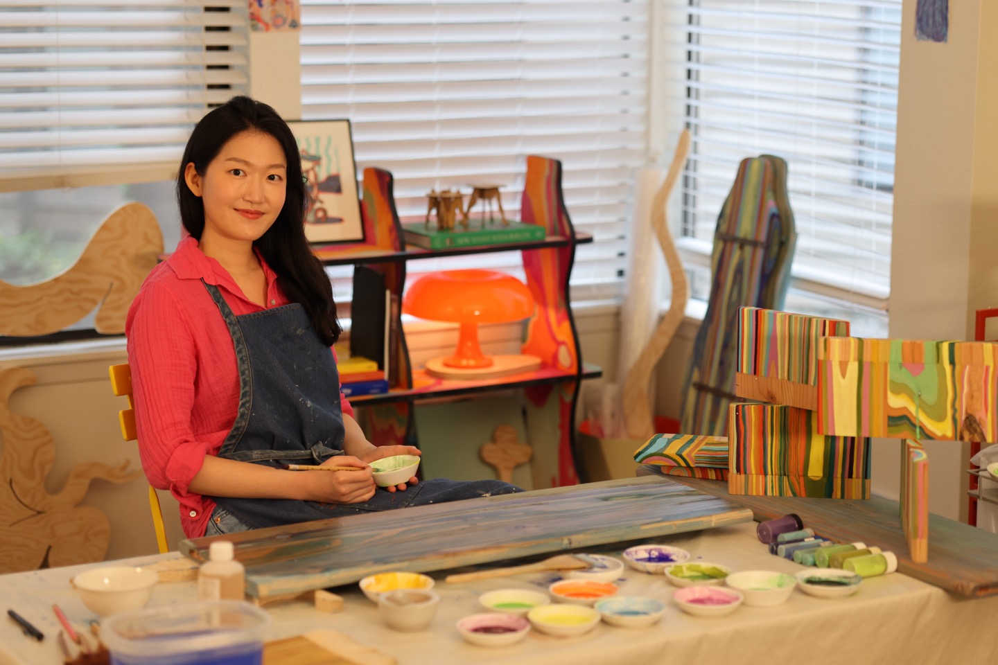 This relationship with nature continues in my studio practice. Working with wood feels like following nature’s footsteps; each tree ring carries its own grain, texture, and memory of time. As I follow the natural grain, I allow color to gradually permeate the surface, layer by layer, much like rain soaking into a forest.