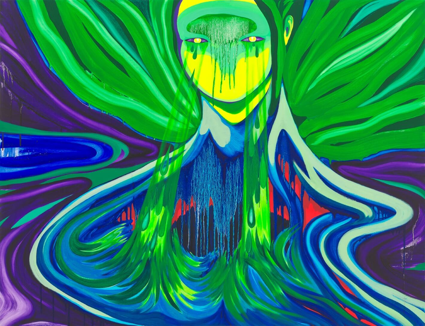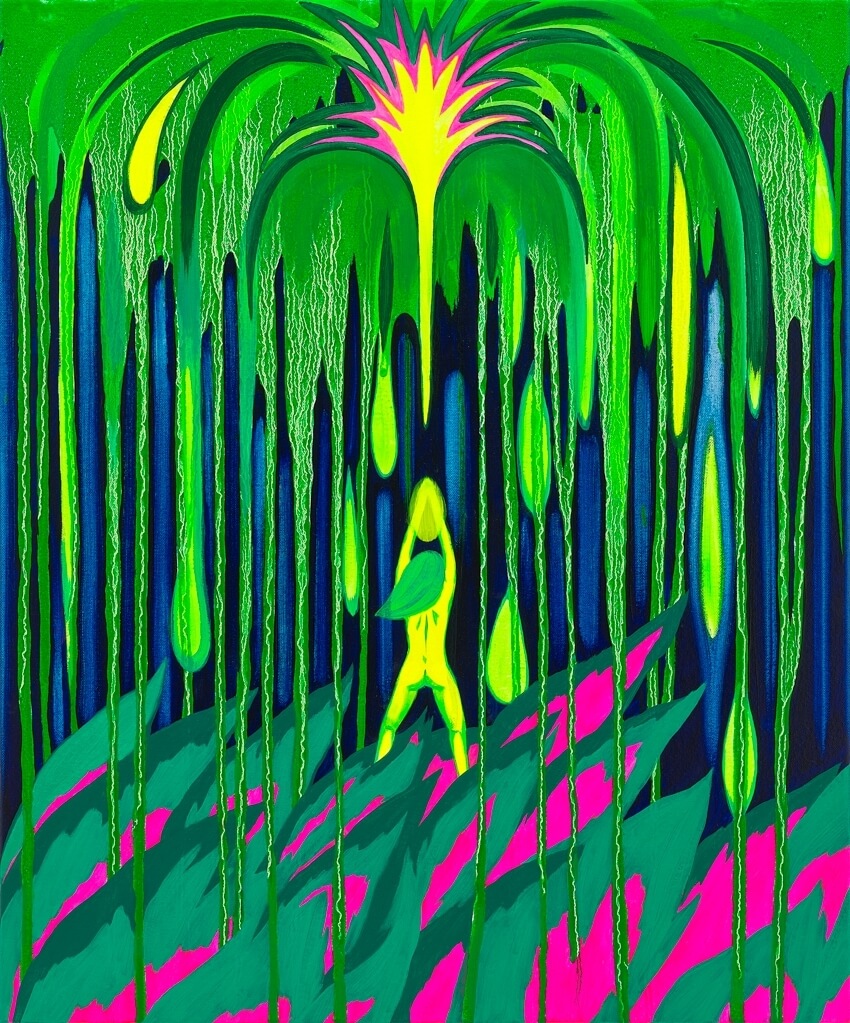 Following the pandemic, Namu drew inwardly even more. Indeed, the overwhelming burden of protecting her family in the face of danger ended up driving her to the verge of extreme lethargy. It was at this point that she decided to revive her long-neglected and withered plant pots, rejuvenating herself with the strong vitality of nature and reclaiming memories of the incredible flora that graced her life in South Okinawa during the early days of her immigration. In her “Green Fire” series, fire is represented as a resuscitating rather than an all-consuming force. Despite being positioned at the ecosystem’s rock bottom, the energy emanating from her flora is fiercely positive, constantly reproducing and spreading like wildfire to create entire forests amidst otherwise desolate environments. Moreover, the figures in these paintings imbibe the condensed energy of nature, projecting inner fire via laser beams in a more determined manner, and evolving into strong-willed creatures with newfound twinkles in their eyes.