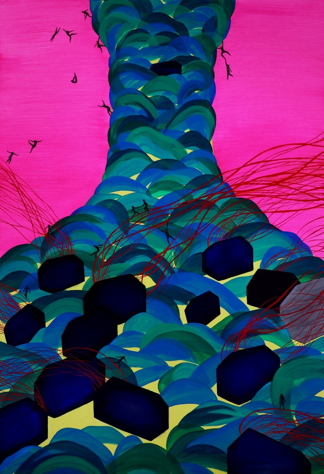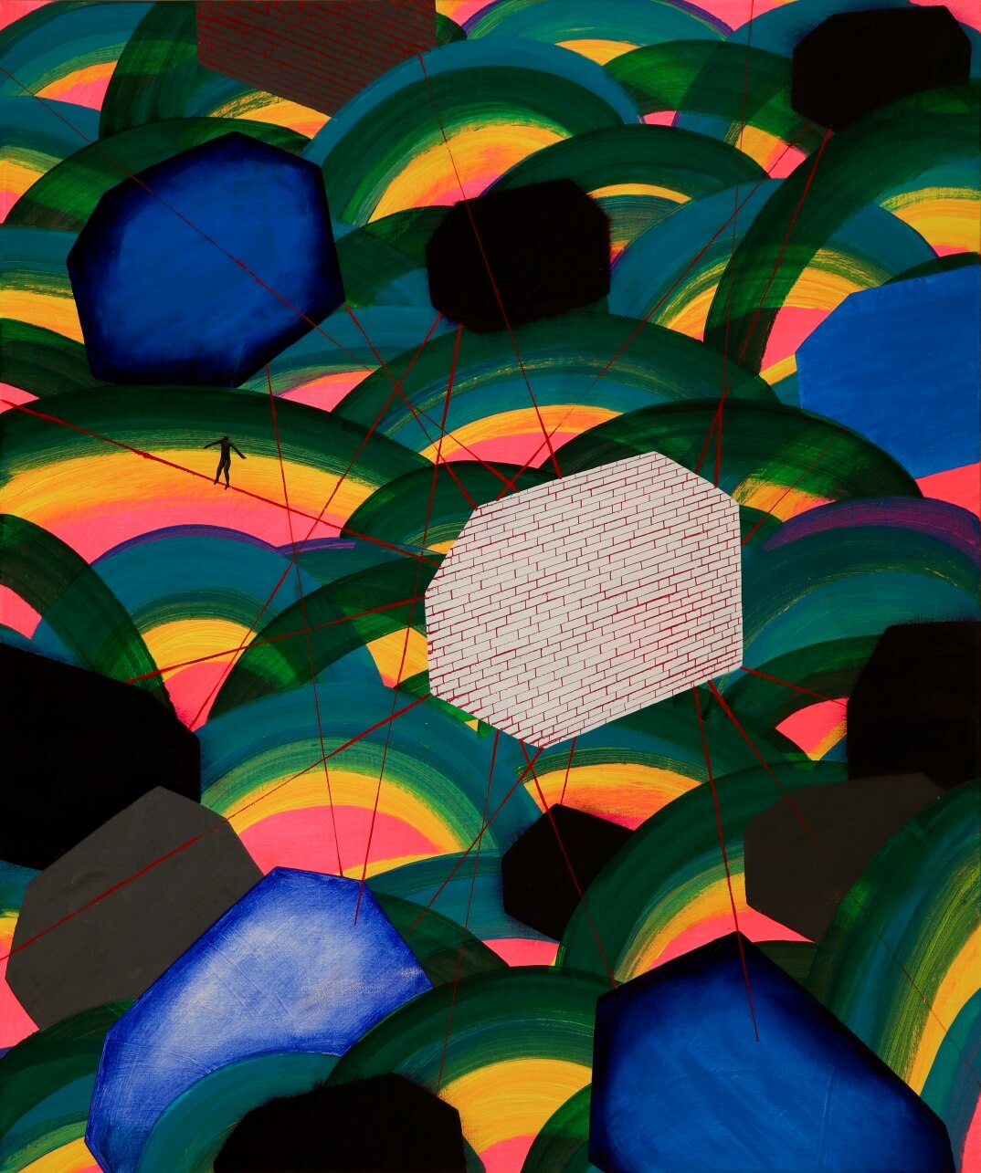 For Namu, a house is both an anxiety-laden construct as well as a sanctuary, often expressed as floating about unrooted, without windows or doors, or engulfed by gigantic mountains or waves. Symbolic of social media, her tiny figures can be seen walking on or clinging to fragile threads that subtly connect one house to the next. These frail, thus easily breakable strands of chance encounters provide Namu with a shred of hope, reinforcing the fact that she does exist, and is not isolated in this world after all.