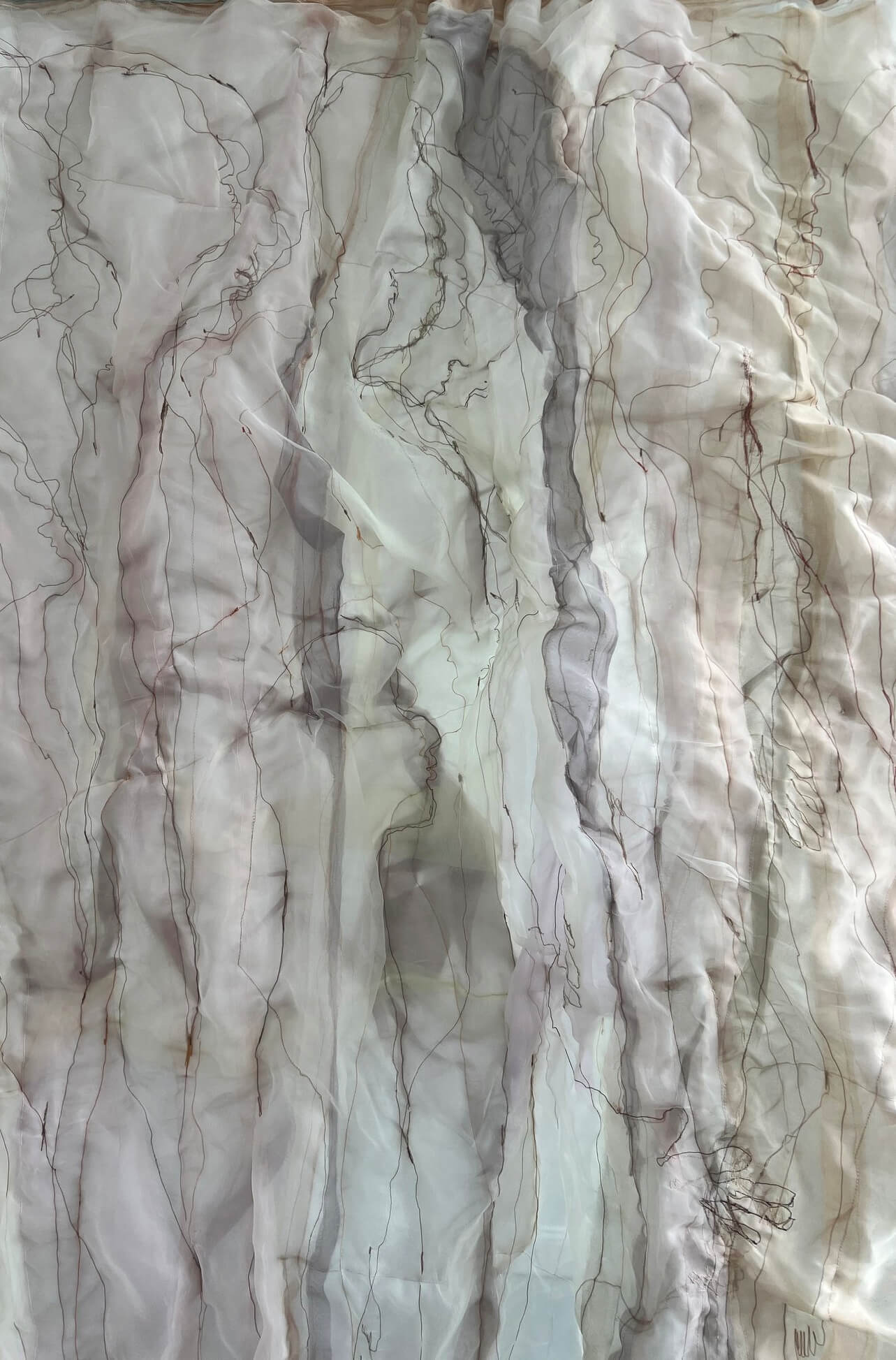 While planning an installation at Iron Velvet Gallery in 2021, the curator encouraged Jean to engage with the architectural particularities of the venue’s window space. It was then that she turned to Nobang, a traditional Korean silk. In these hanging textiles, Jean layers colored fabrics and draws on them using a sewing machine, allowing the mechanical rhythm of the device to collide with her freehand gestures, and fragmented human elements to appear, disappear, overlap, and shift through the translucency of the material. The spatial arrangement, the spectator’s movement, and the changing light conditions all become a part of the experience. Rather than projecting a fixed image or narrative, emergent folds, twists, and structures form beyond Jean’s intentions, creating public-facing situations where meaning remains fluid, unresolved, and (re)shaped through the magic of lived experience.